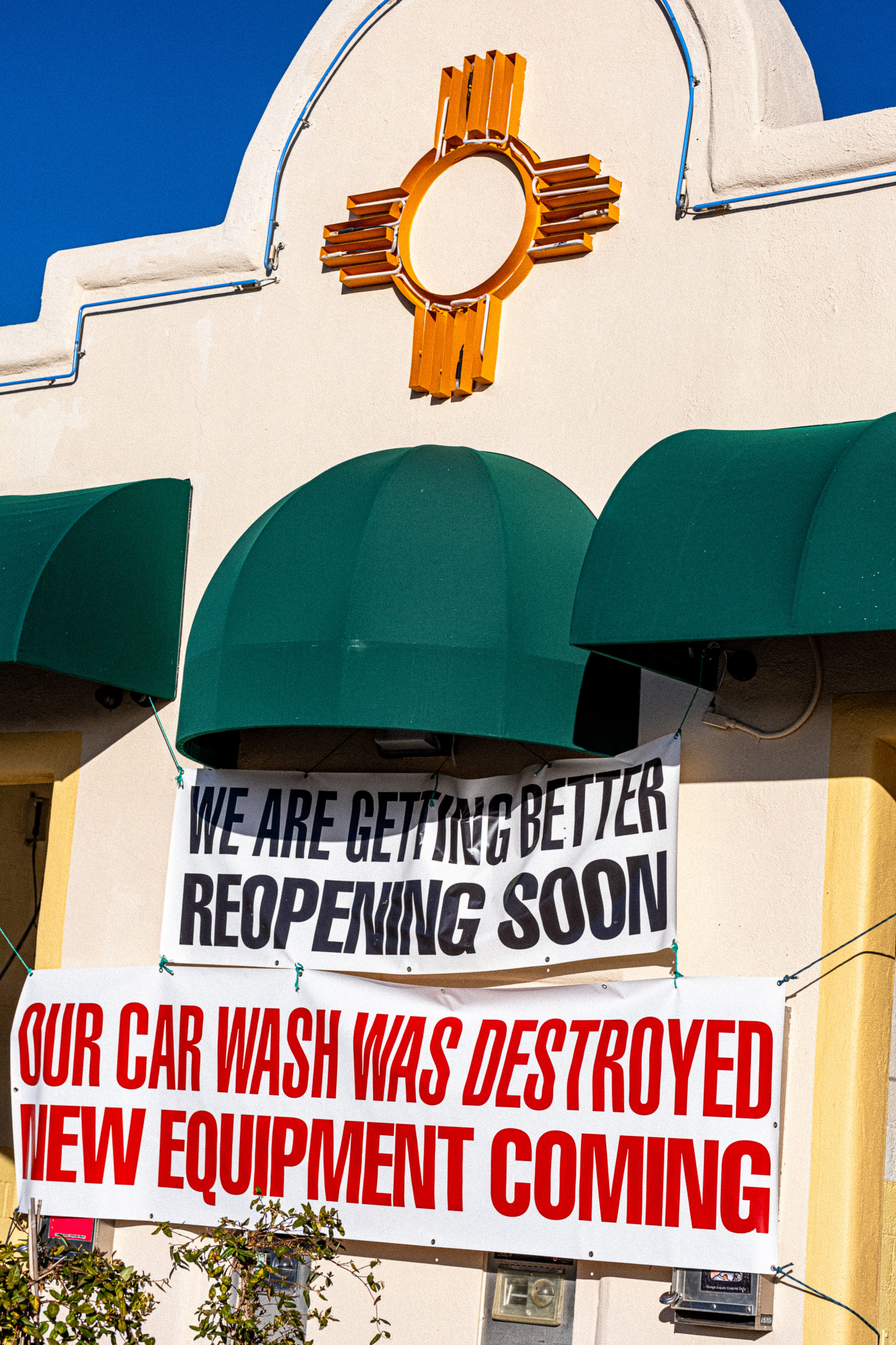 Something about the selection of words used in the series of banners on the Zia Car Wash resonates with me. The first banner, stating "We Are Getting Better, Reopening Soon," followed by "DESTROYED," seems familiar.