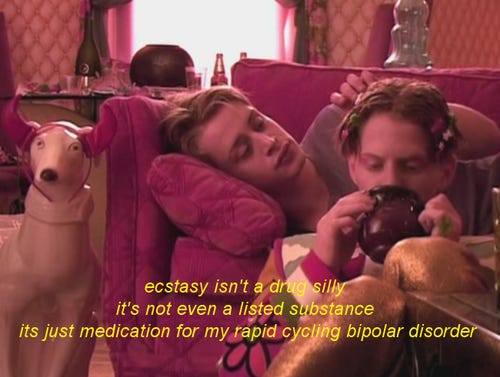 I needed a distraction. "I'm gay," I said. That's why I was acting like a maniac. She started crying, but then told me it wasn't out of sadness or because she was upset about the news. Her high school boyfriend, she said, always told her I was gay—not in a derogatory way, but in an "it's obvious" way. She was crying because she knew it wouldn't be easy for me, but she was happy I told her. I was happy I told her too. I've always loved ecstasy because of this. I haven't done it since.